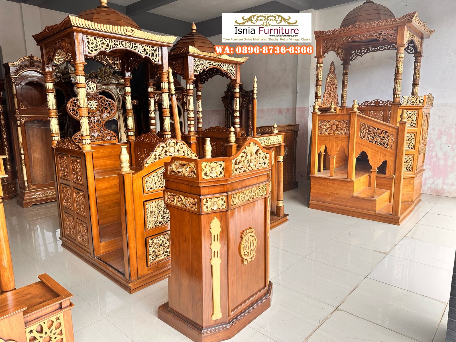 Mencari Mimbar Masjid berkualitas di Makasar? Kami menjual berbagai produk pilihan Mimbar Masjid di Makasar dengan kualitas premium yang terbuat dari bahan kayu jati terbaik yang dirancang untuk memberikan keindahan dan kenyamanan pada setiap ibadah. Kayu jati terkenal dengan ketahanannya hingga puluhan tahun. Dengan desain elegan dan pengerjaan yang sangat teliti, mimbar masjid kami cocok untuk memperindah rumah ibadah Anda dan mendukung setiap acara keagamaan dengan lebih khusyuk. Dengan keahlian tinggi pengrajin profesional yang telah terkenal di dunia, setiap detail mimbar ini mengusung kesempurnaan dalam ukiran tradisional yang elegan. Proses pengerjaannya menggunakan teknologi terbaru dan diawasi secara teliti, mulai dari pemilihan kayu, proses pemahatan ukiran, sampai proses finishing.