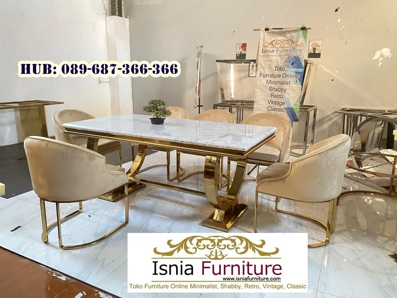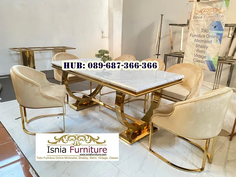 Meja Makan Stainless Marmer Import 6 Kursi adalah jenis meja makan yang memiliki permukaan meja berbahan marmer yang diimport dari luar negeri, seperti dari Italy,Spanyo,Turki. Model ini sangat diminati oleh para kaum milenial yang menjadi ciri khas minimalis tetapi terkesan mewah dan elegan. Bagian rangka atau kaki meja terbuat dari stainless steel dengan kualitas tinggi, sehingga tahan lama, tidak berkarat, dan terlihat elegan. Satu set meja makan ini terdiri dari 6 kursi, dengan bahan kursi dengan perpaduan kaki stinless dan jok velvet warn cream sehingga menampikan sebuah set meja makan yang begitu istimewa.