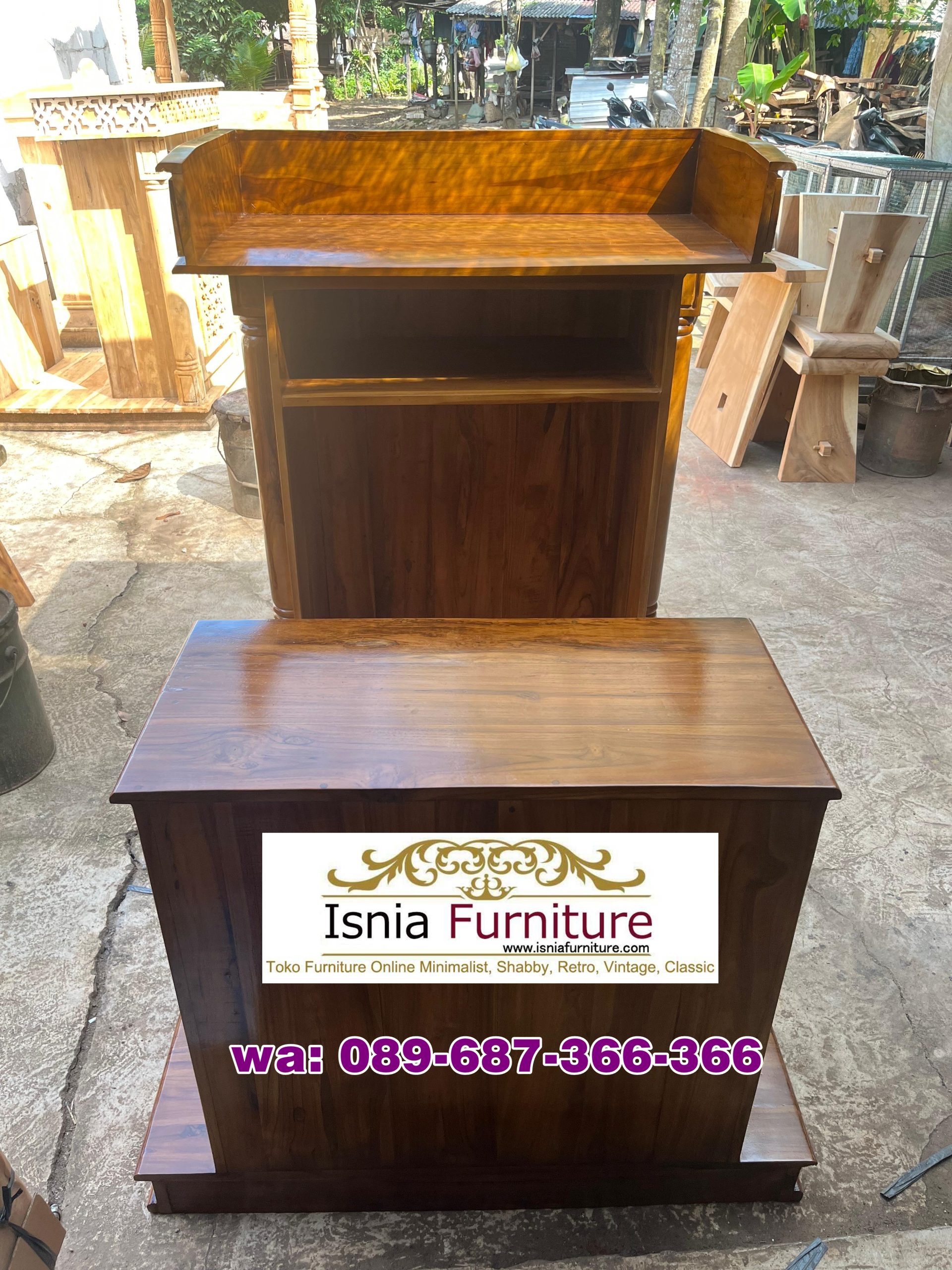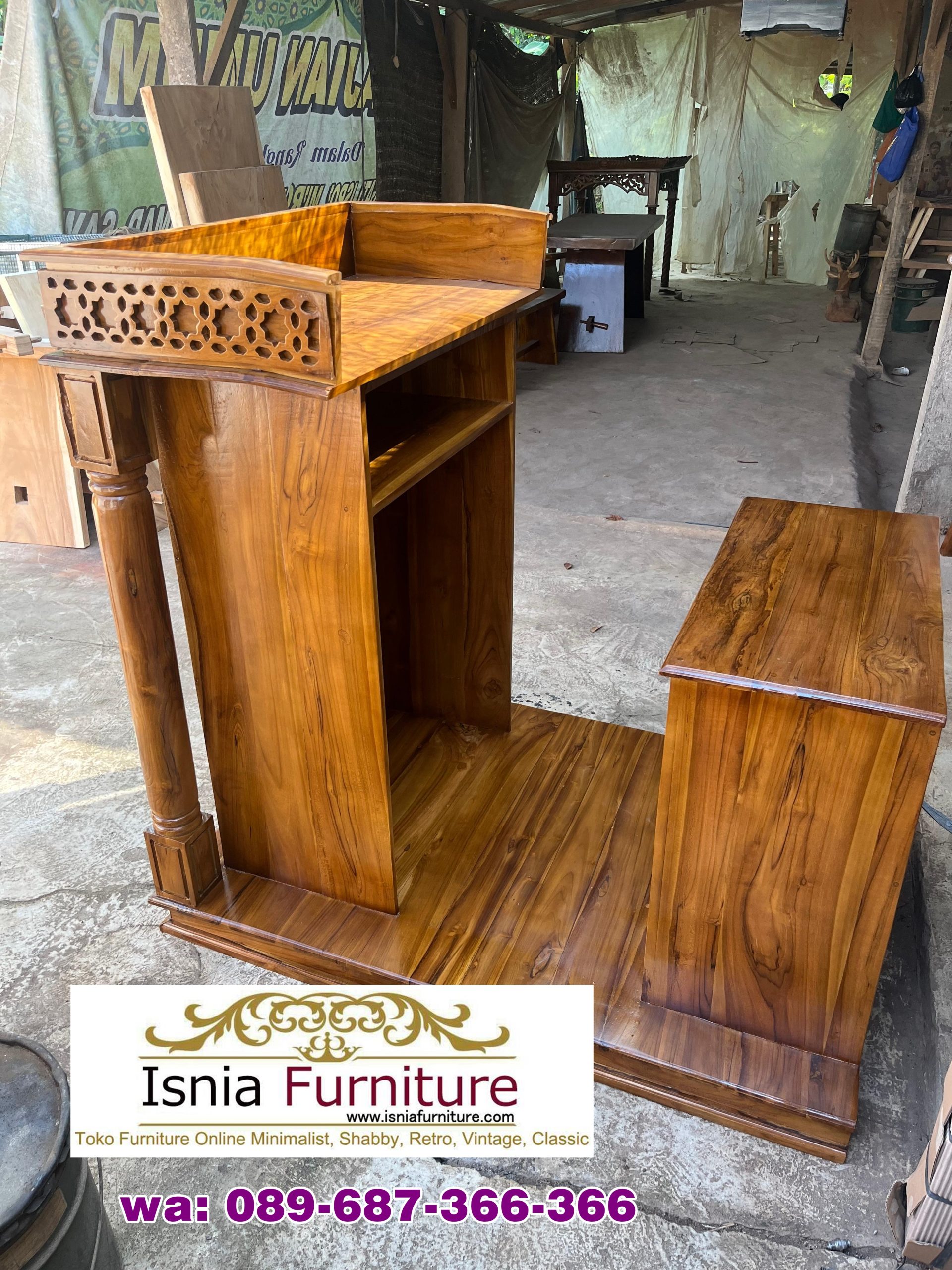 Sekarang banyak mimbar masjid yang terbuat dari berbagai bahan dan berbagai model, Kami menghadirkan berbagai produk mimbar masjid yang berkualitas tinggi salah satunya yaitu Mimbar Masjid Minimalis Dudukan. Desain minimalisnya membuatnya cocok untuk berbagai gaya interior masjid modern, sementara dudukan memberikan kenyamanan bagi khotib saat berbicara. Mimbar dirancang dengan garis-garis bersih dan sederhana, tanpa hiasan yang berlebihan, sehingga cocok untuk interior masjid yang modern. Mimbar masjid ini terbuat dari bahan kayi jati yang memiliki banyak kelebihan. Model ini memberikan kenyamanan bagi khutbah karena adanya tempat duduk, sehingga imam tidak perlu berdiri terus menerus. Desain minimalis juga membuat mimbar terlihat lebih bersih, rapi, dan modern, cocok untuk berbagai gaya masjid. Desain minimalis cenderung membuat ruang lebih terbuka dan luas. Mimbar minimalis dengan dudukan mudah dibersihkan dan dirawat.