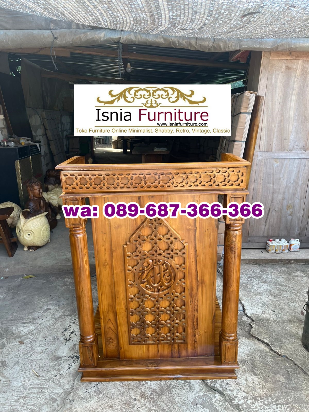 Mimbar dilengkapi dengan dudukan yang nyaman untuk khotib, memungkinkan mereka untuk berbicara dalam posisi yang lebih nyaman. Mimbar masjid minimalis ini juga dilengkapi dengan ukiran minimalis atau ukiran kaligrafi untuk menambah keindahan dan nilai artistik. Mimbar dengan hiasan ukiran, baik ukiran minimalis, ukiran kaligrafi, atau ukiran arab, dapat memberikan kesan mewah dan elegan. Setiap ukiran dibuat oleh pengrajin yang profesional asli Jepara. Proses pengerjaannya menggunakan teknologi terbaru dan diawasi secara teliti, mulai dari pemilihan kayu, proses pemahatan ukiran, sampai proses pengecetan. Mimbar Masjid Minimalis Dudukan mempunyai harga yang sangat kompetitif dan sesuai dengan kualitas produk. Kami menawarkan semua produk dengan harga standar namun tidak menguragi kualitas dari produk.