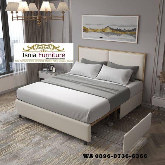 Tempat tidur yang sekarang paling diminati adalah desain modern tetapi terlihat simpel. Untuk menata tempat tidur sorong di ruang kamar Anda, penyesuaian konsep kamar dan tempat tidur juga sangat penting juga loh! Contohnya pada produk kami sangat cocok sekali diletakkan dimana saja karena tempat tidur tersebut kami desain semodern dan sesimpel itu supaya konsep ruan kamar dan tempat tidur dapat menyatu dan bisa memberikan kesan yang modern dan nyaman jika digunakan untuk beristirahat.
