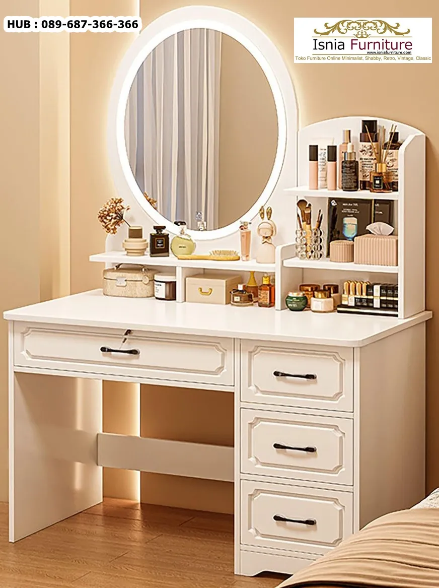 Beberapa orang mungkin menyukai Meja Rias Simpel karena simpel membuat ruangan terasa lega dan luas, dah taukan funsgi meja rias untuk apa? meja rias bukan hanya sebagai tempat untuk makeup dan skincare saja tetapi juga merupakan kelengkapan yang harus ada di dalam kamar seorang wanita, karena sebagai tempatĀ  menyimpan aneka macam jenis makeup, serta peralatan kecantikan. Dengan meja tersebut, maka bisa menata alat perawatan wajah dan tubuh, serta produk kecantikan dengan rapi.