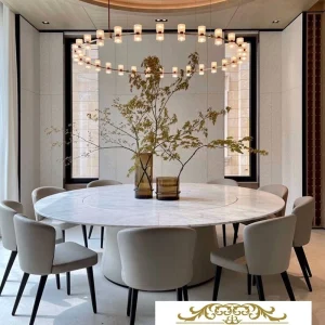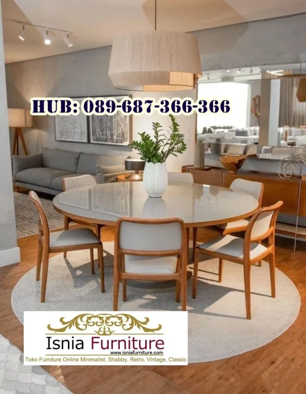Meja makan yang mempunyai 6 kursi cocok untuk keluarga atau ruang makan yang tidak terlalu kecil. Meja ini biasanya berbentuk persegi panjang, bulat, atau lonjong, dan sudah dilengkapi dengan enam kursi yang sesuai dengan desainnya.